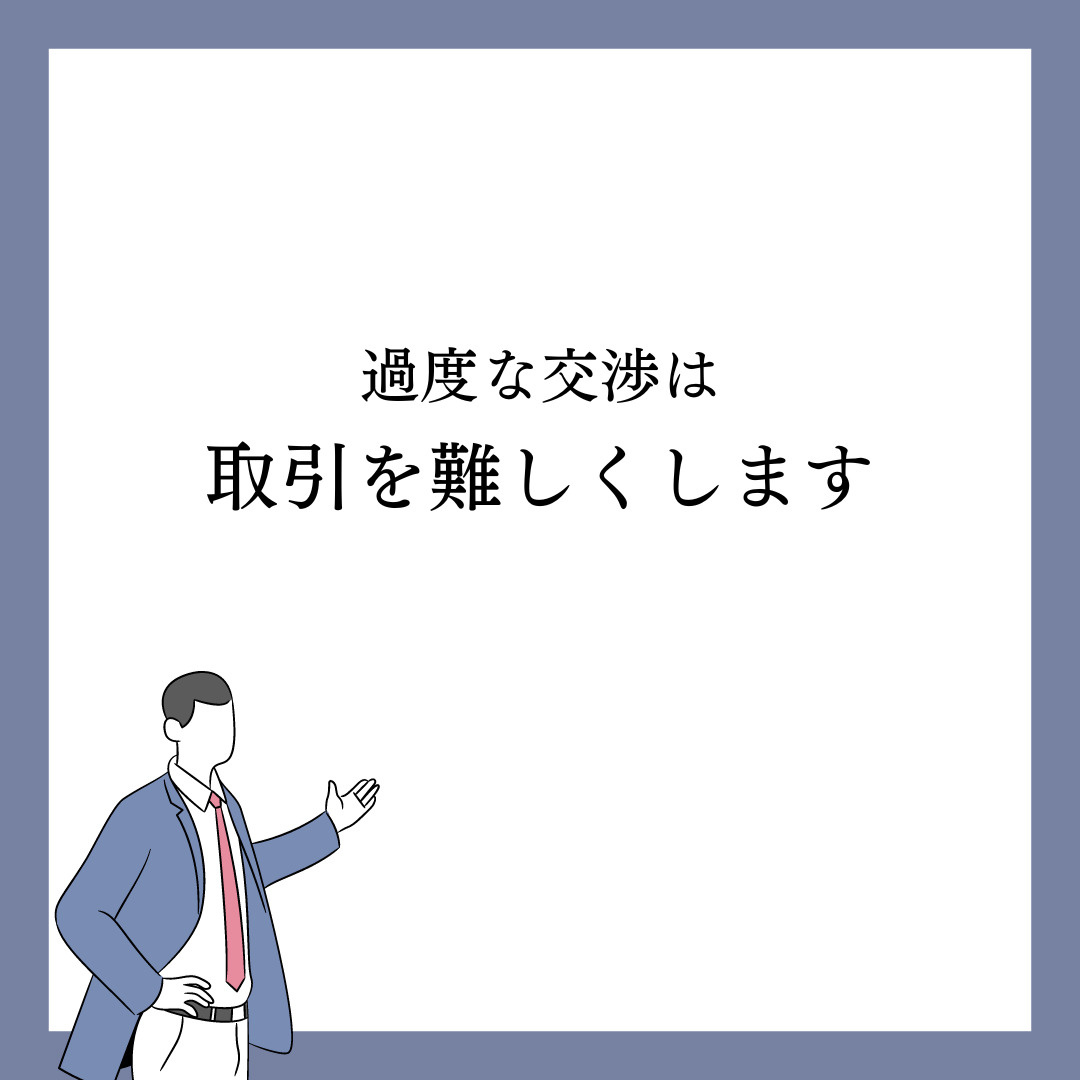 契約と交渉はバランスの取れたプロセスです。売主と買主はお互いの要望を尊重し、妥協点を見つけることが必要です。過度な交渉は取引を難しくし、成功への障害となります。良好なコミュニケーションと適切な交渉戦略は、双方にとって利益をもたらします。
